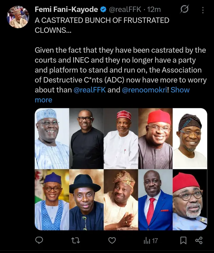 While he was reacting to the development, Femi Fani-Kayode on his verified X handle wrote, “Given the fact that they have been castrated by the courts and INEC and they no longer have a party and platform to stand and run on, the Association of Destructive C*nts (ADC) now have more to worry about than Femi Fani-Kayode and Reno Omokri.”