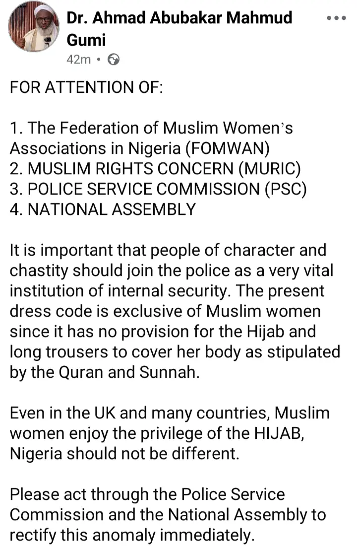 Prominent Islamic cleric, Ahmad Abubakar Mahmud Gumi, has called on key national institutions to review the Nigeria Police recruitment dress code, arguing that it excludes Muslim women.