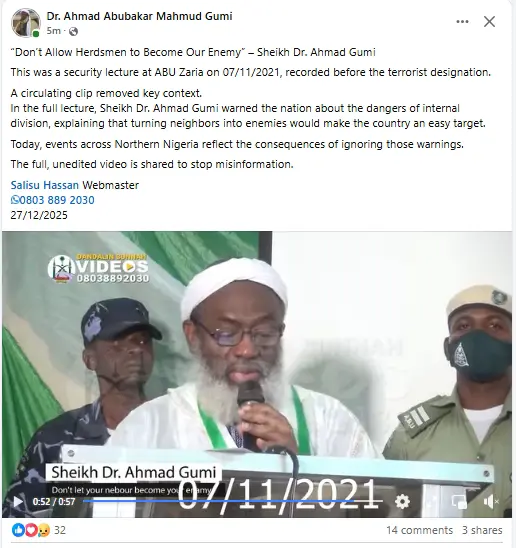 The reaction was conveyed through a post shared on Facebook on Saturday, December 27, 2025. According to the post, the footage was recorded during a security lecture delivered by Sheikh Gumi at Ahmadu Bello University (ABU), Zaria, on November 7, 2021, before the designation of herdsmen as terrorists..