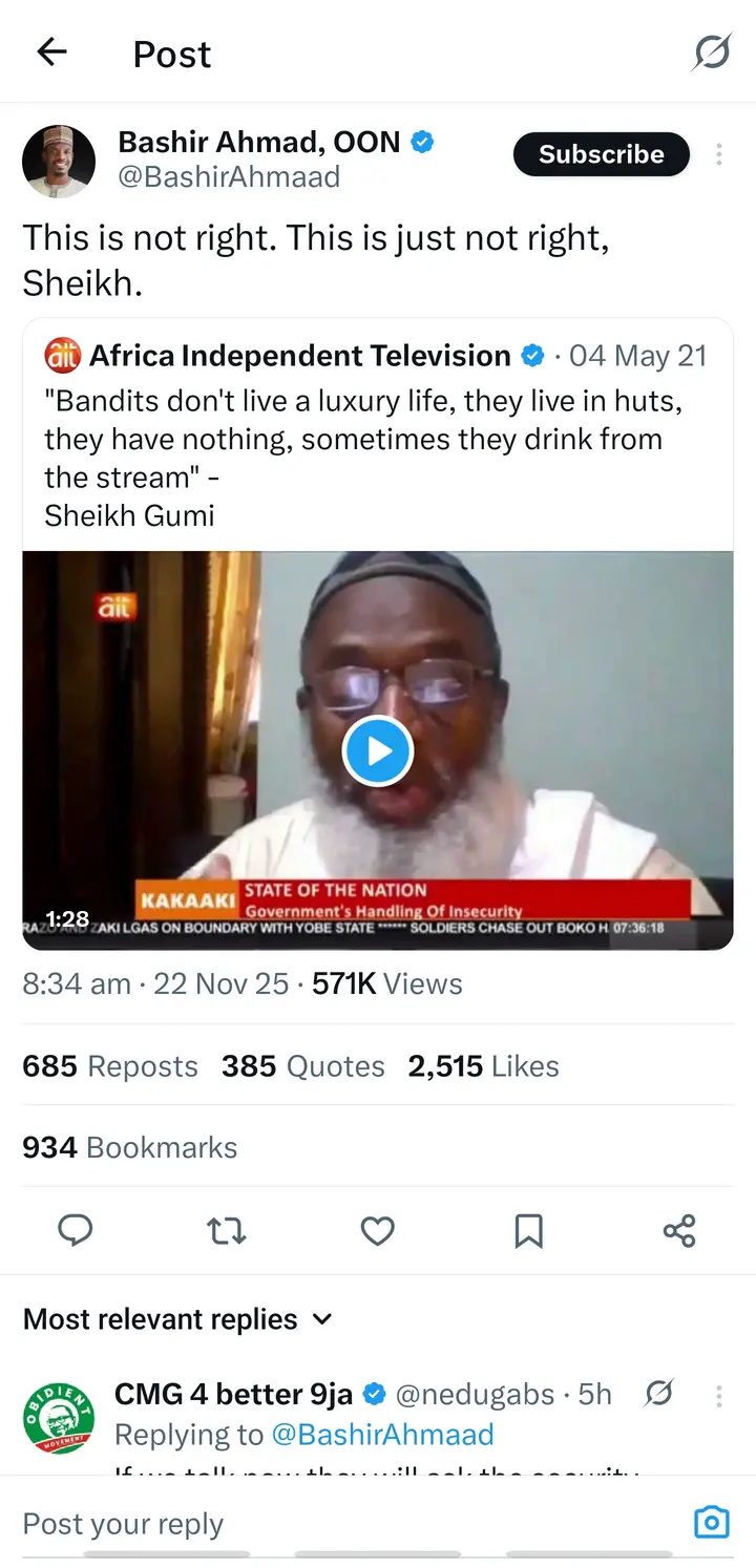 In a post on X (formerly Twitter), Ahmad quoted Gumi’s 2021 remark: “Bandits don’t live a luxury life, they live in huts, they have nothing, sometimes they drink from the stream.” Ahmad’s response was direct and unequivocal: “This is not right. This is just not right, Sheikh.” He reacted.