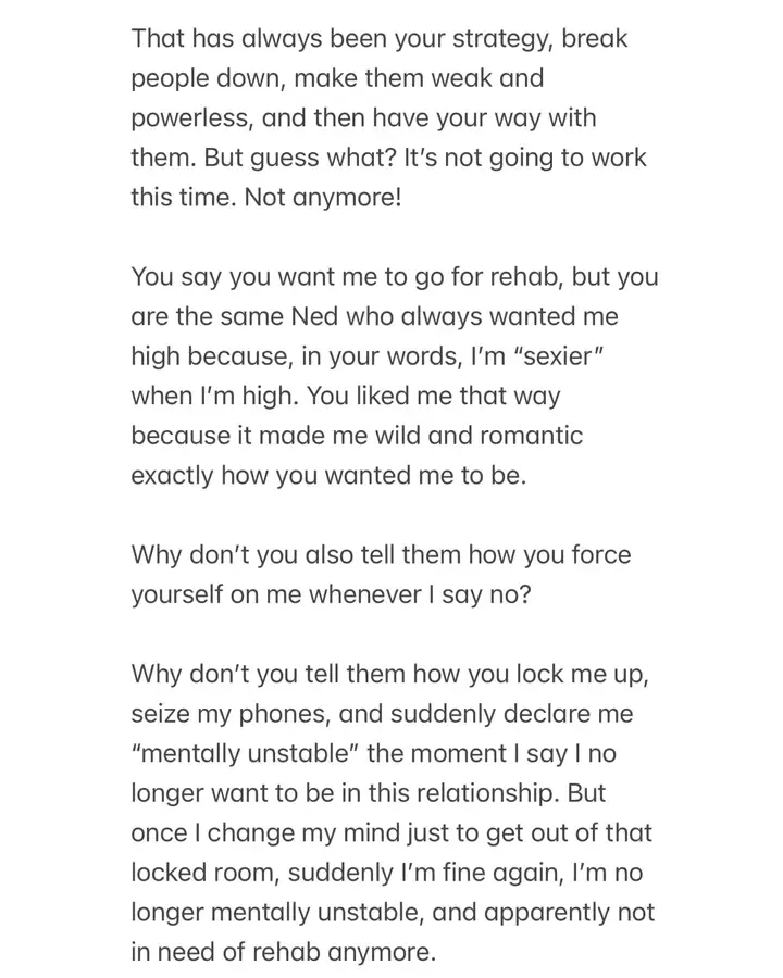 According to her, her husband, Ned Nwoko always wanted her to be high while making out, because to him, she looked more sexier, wild and romantic when she was high on drugs, exactly how Ned wanted her to be, and that whenever she said no to him, he will force himself on her.
