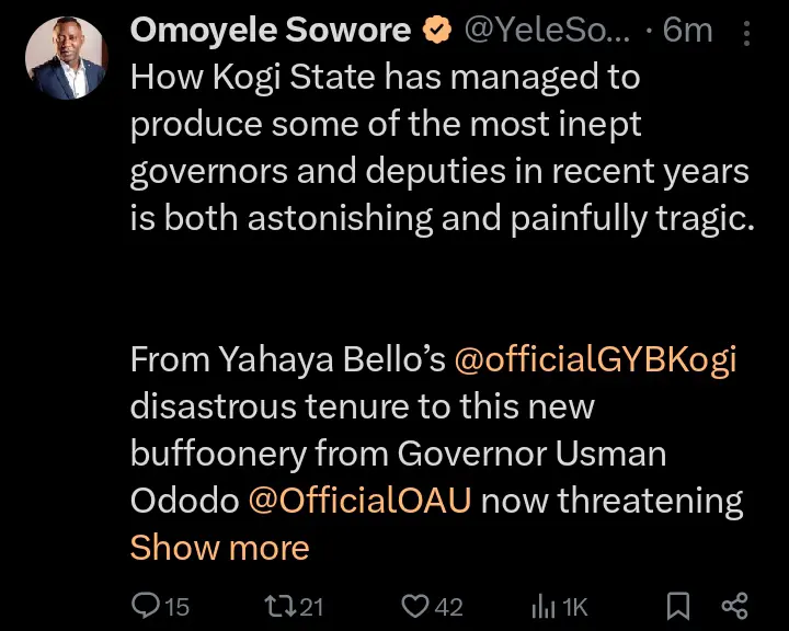 “How Kogi State has managed to produce some of the most inept governors and deputies in recent years is both astonishing and painfully tragic. From Yahaya Bello’s @officialGYBKogi disastrous tenure to this new buffoonery from Governor Usman Ododo @OfficialOAU now threatening citizens that his administration “will not tolerate criticism” and that security agencies funded by taxpayers will be deployed to suppress civil rights it is clear that Kogi has become a breeding ground for political mediocrity backed by authoritarian tendencies. Citizens must stand up to these political goons. No society progresses by surrendering its voice or its dignity.”