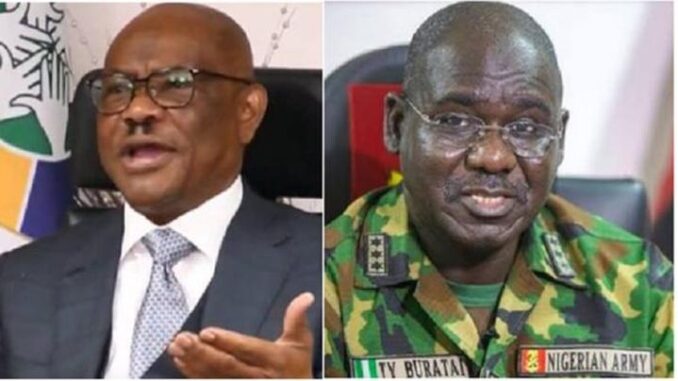 Wike questioned the statement made by former Chief of Army Staff, Lieutenant General Tukur Yusuf Buratai (rtd), that his action posed a threat to national security and undermined the authority of President Bola Tinubu.