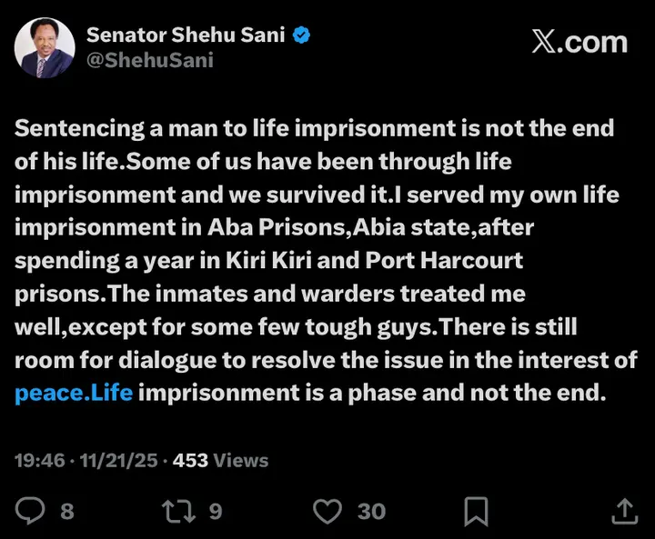 In his post, he wrote: “Sentencing a man to life imprisonment is not the end of his life. Some of us have been through life imprisonment and we survived it.” Recalling his years behind bars, he stated: “I served my own life imprisonment in Aba Prisons, Abia State, after spending a year in Kiri Kiri and Port Harcourt prisons.”