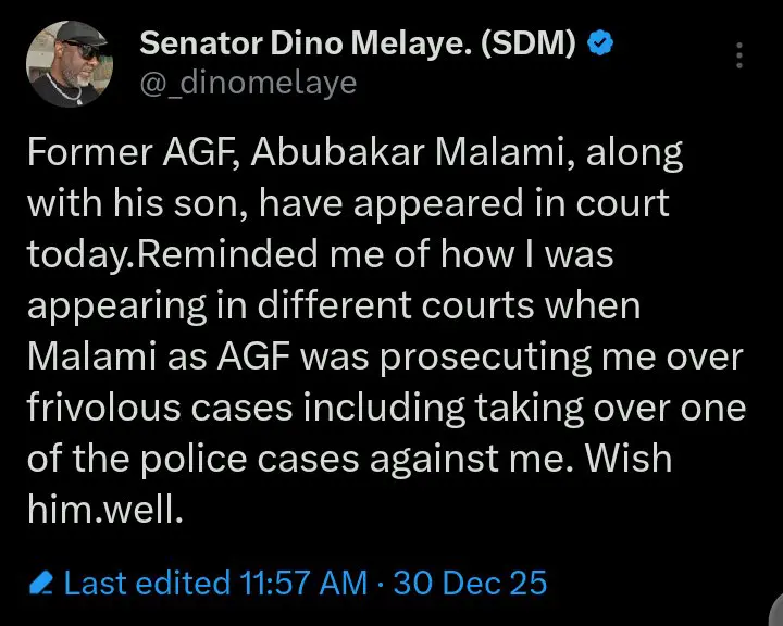 On Tuesday, December 30, 2025, Melaye posted on his verified X account in response to reports that a Federal High Court in Abuja had ordered Malami’s remand at the Kuje Correctional Centre.