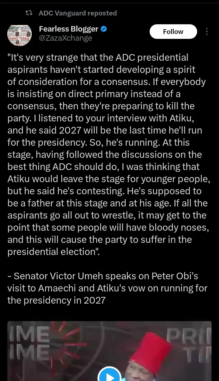 Sen. Umeh made the remarks in a post shared via the X account (formerly Twitter) of Fearless Blogger on Monday, April 20, 2026, while reacting to recent political developments involving key opposition figures, including Peter Obi and Atiku Abubakar.