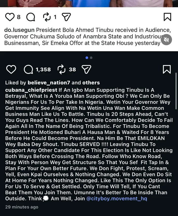 In the post, he wrote, “If An Igbo Man Supporting Tinubu Is A Betrayal, What Is A Yoruba Man Supporting Obi ? We Can Only Be Nigerians For Us To Per Take In Nigeria. Wetin Your Governor Wey Get Immunity See Align With Na Wetin Una Wan Make Common Business Man Like Us To Battle.”