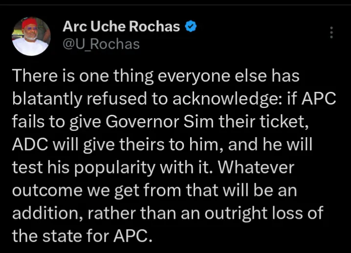 His words, “There is one thing everyone else has blatantly refused to acknowledge: if APC fails to give Governor Sim their ticket, ADC will give theirs to him, and he will test his popularity with it. Whatever outcome we get from that will be an addition, rather than an outright loss of the state for APC.”