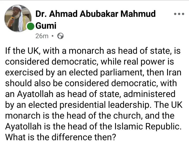 The United Kingdom, according to Sheikh Gumi which has a monarch as the head of state was considered democratic, therefore, Iran should also be considered democratic.