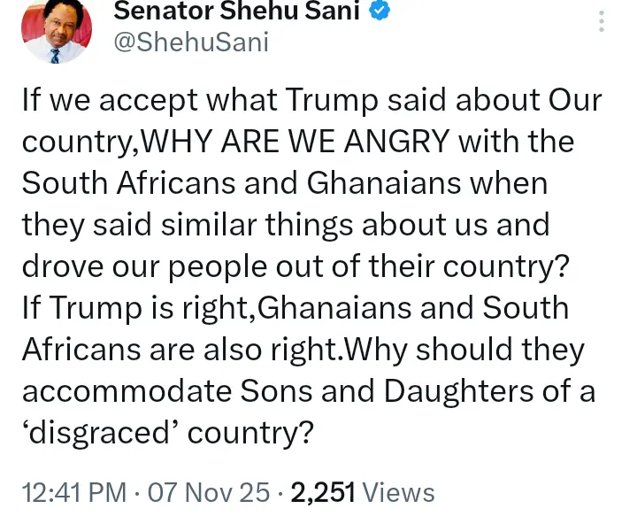 Senator Shehu Sani said if Donald Trump is right to have called Nigeria a disgraced country, South Africans and Ghanaians shouldn’t be blamed for sending Nigerians out of their countries.