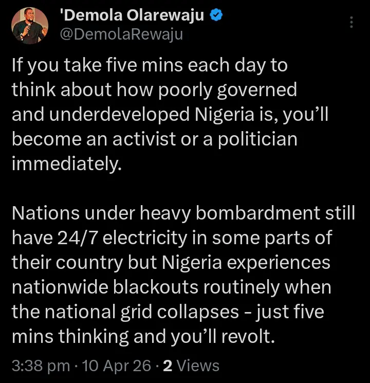 “If you take five mins each day to think about how poorly governed and underdeveloped Nigeria is, you’ll become an activist or a politician immediately. Nations under heavy bombardment still have 24/7 electricity in some parts of their country but Nigeria experiences nationwide blackouts routinely when the national grid collapses – just five mins thinking and you’ll revolt…See More
