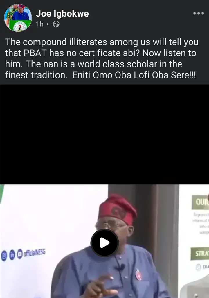 In his post, Igbokwe stated, “The compound illiterates among us will tell you that PBAT has no certificate, right? Now listen to him. The man is a world-class scholar in the finest tradition. Eniti Omo Oba Lofi Oba Sere!!!”