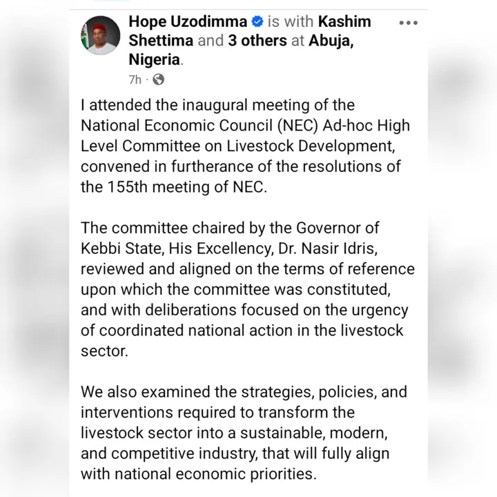 The executive Governor of Imo State and chieftain of the All Progressives Congress, Hope Uzodimma stated on his verified Facebook page on Tuesday; “I attended the inaugural meeting of the National Economic Council (NEC) Ad-hoc High Level Committee on Livestock Development, convened in furtherance of the resolutions of the 155th meeting of NEC.”