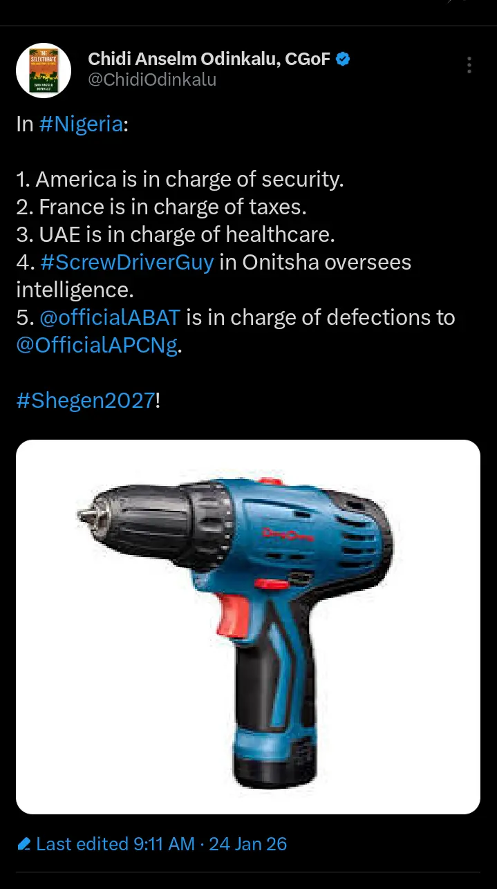 ”In Nigeria: America is in charge of security. France is in charge of taxes. UAE is in charge of healthcare. Screwdriver guy in Onitsha oversees intelligence. @officialABAT is in charge of defections to @OfficialAPCNg,” he wrote
