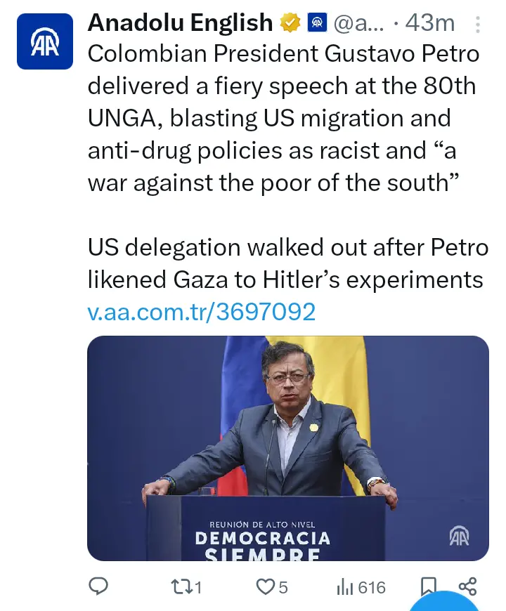 According to a report by Anadolu English on Wednesday 24 September, 2025, the President of Columbia, Gustavo Petro, while addressing the United Nations General Assembly in New York, the United States of America, framed President Donald Trump’s immigration policies as a tool for racial segregation, asserting that such policies were not about border security, but served a darker purpose which were to create a rich, white and racist society built on the concept of a superior race.