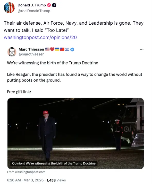 Together, the statements conveyed an image of total strategic dominance and diplomatic closure. By asserting the elimination of Iran’s air defense systems, Air Force, Navy, and leadership structure, Trump characterized the situation as one of overwhelming consequence. His insistence that attempts to initiate talks came “Too Late” reinforced a narrative of decisive action followed by resolute refusal to reopen discussions……See More