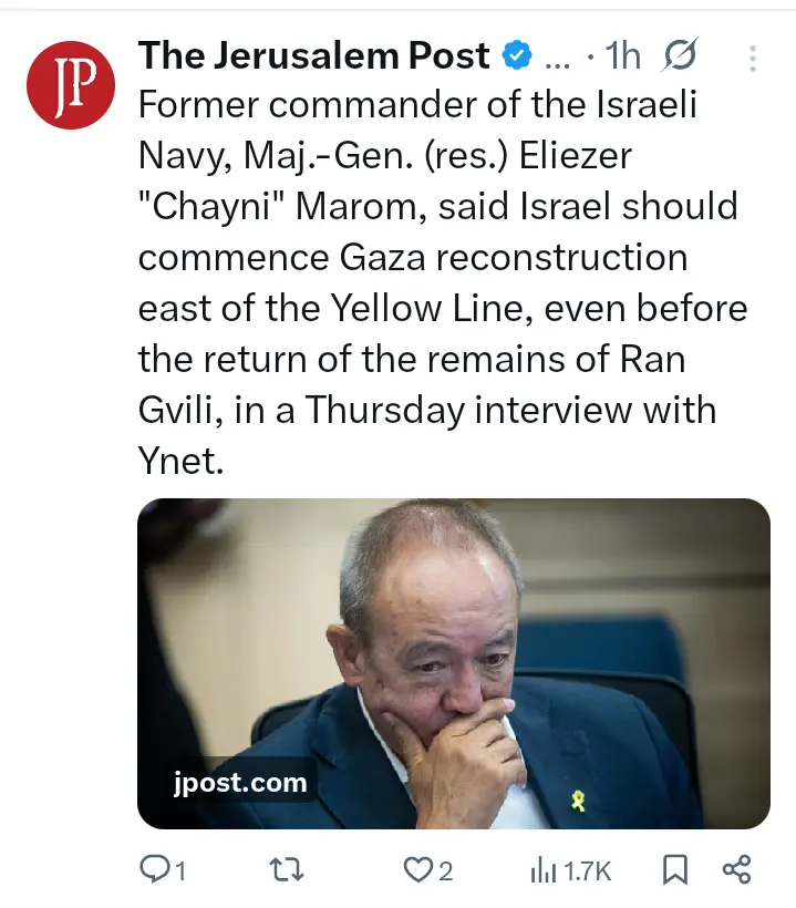 A former top Israeli military commander had publicly urged the Israeli regime under the leadership of the Prime Minister of the State of Israel, Benjamin Netanyahu that they should break a major point of deadlock, and begin reconstructing parts of Gaza immediately, even before the return of all hostages.
