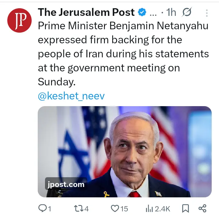 According to a report by the Jerusalem Post on Sunday 4 January, 2025, the Prime Minister of the State of Israel, Benjamin Netanyahu while speaking at the opening of a cabinet meeting on Sunday, framed the ongoing protests as a potential historic turning point, signaling a bold new diplomatic and psychological offensive against the Government of the Islamic Republic of Iran under the leadership of the Supreme Leader of the Islamic Revolution, Ayatollah Seyyed Ali Khamenei from its arch-nemesis.
