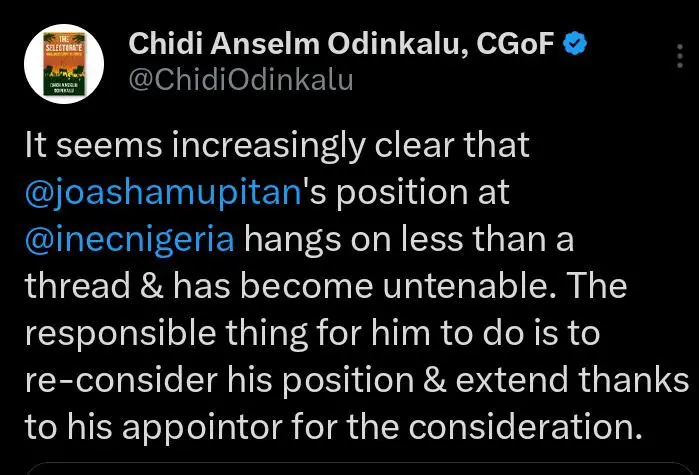 Former Chairman of the National Human Rights Commission, Chidi Odinkalu, has stated that the position of the Chairman of the Independent National Electoral Commission, Joash Ojo Amupitan, appears increasingly uncertain amid ongoing allegations surrounding the leadership of the electoral body.