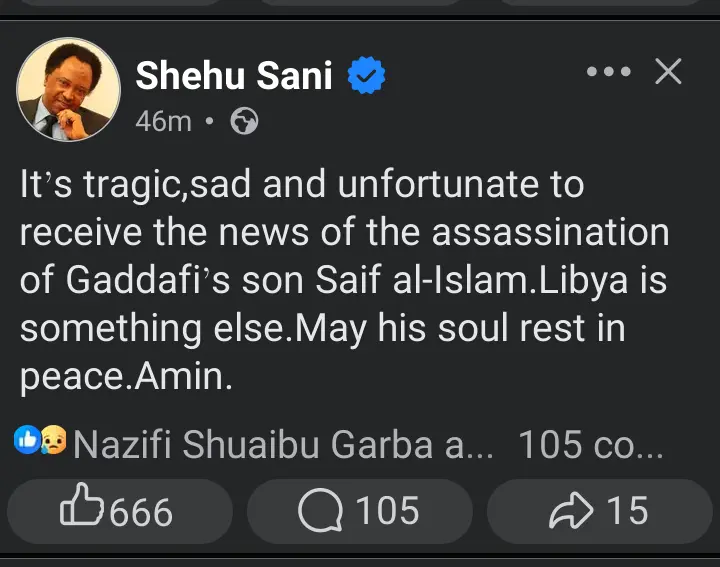 Former Nigerian senator and human rights activist Shehu Sani has expressed deep sorrow over reports confirming the assassination of Saif al-Islam Gaddafi, son of Libya’s former leader, Muammar Gaddafi.