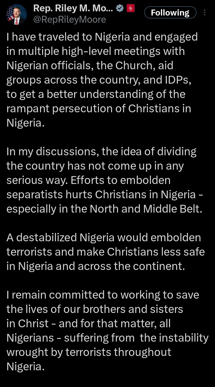 During his engagements, Moore emphasized that discussions did not seriously entertain the idea of dividing Nigeria. He explained that separatist movements undermine the safety of Christians, particularly in the North and Middle Belt, and warned that destabilization would embolden terrorist groups, making Nigerians more vulnerable.