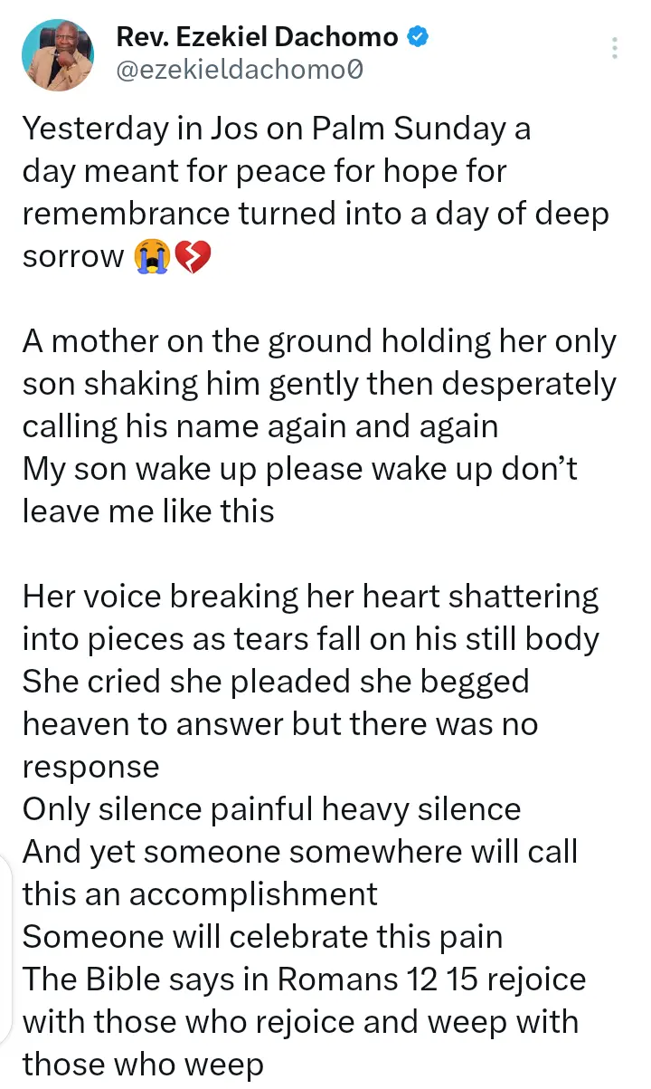 Popular Nigerian pastor, Reverend Ezekiel Dachomo has reacted to the terrorists attack that claimed the lives of many people in Jos, Plateau state.