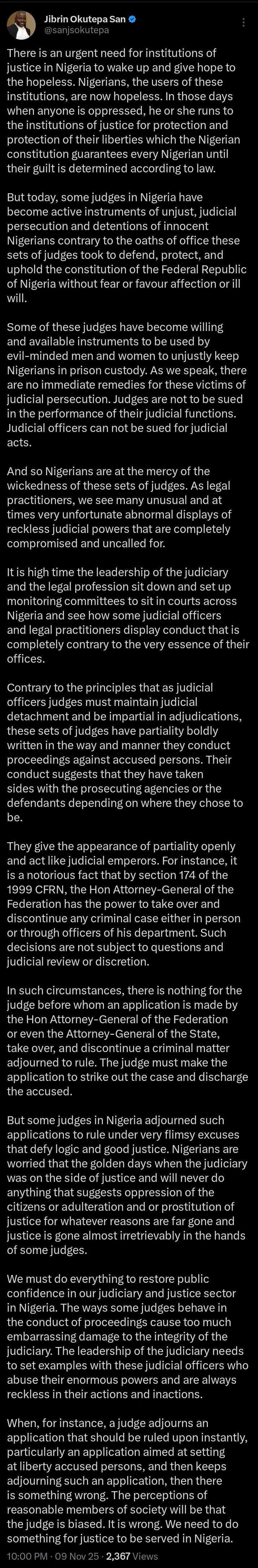 And so Nigerians are at the mercy of the wickedness of these sets of judges. As legal practitioners, we see many unusual and at times very unfortunate abnormal displays of reckless judicial powers that are completely compromised and uncalled for,” he wrote.