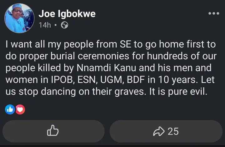 In a widely shared Facebook post, Igbo specifically called on Southeast residents to honor the hundreds of people he claims lost their lives in connection with groups such as IPOB (Indigenous People of Biafra), ESN (Eastern Security Network), UGM, and BDF, all linked to the detained IPOB leader, Nnamdi Kanu.