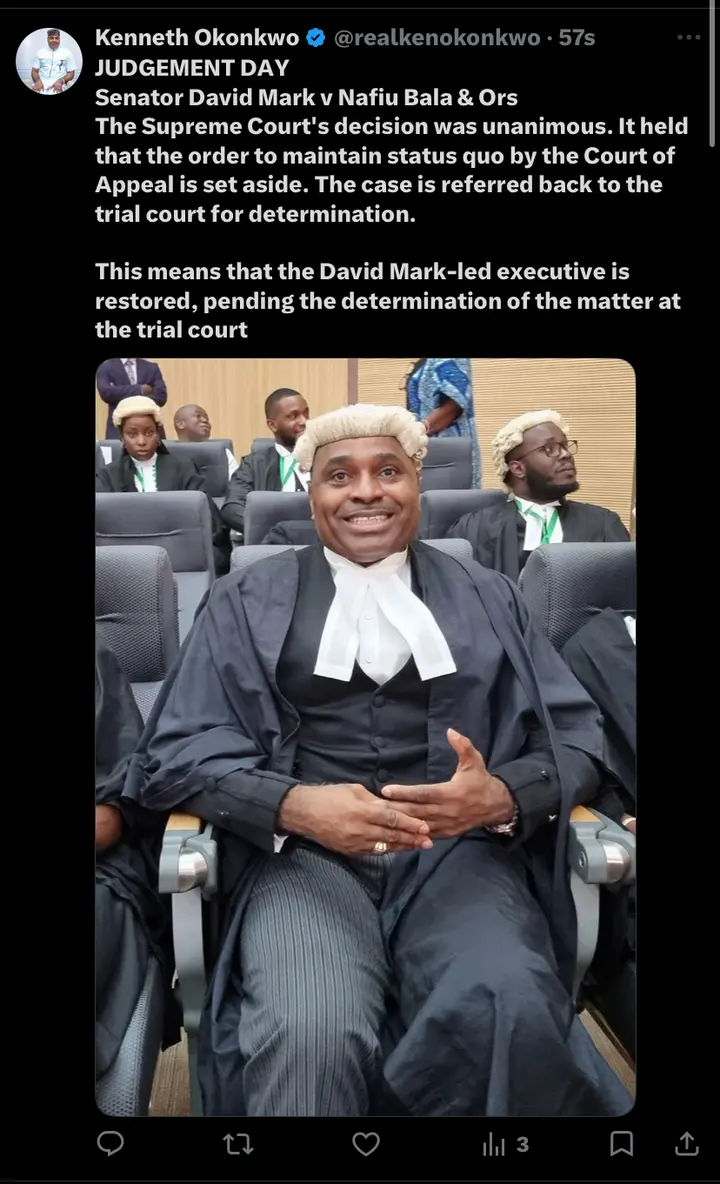 He wrote, “The Supreme Court’s decision was unanimous. It held that the order to maintain status quo by the Court of Appeal is set aside. The case is referred back to the trial court for determination. This means that the David Mark-led executive is restored, pending the determination of the matter at the trial court.”
