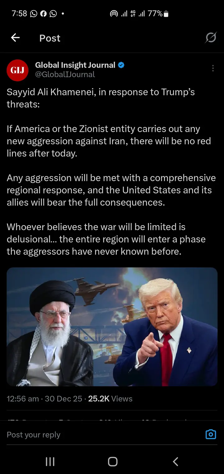 Khamenei made the remarks while responding to recent threats attributed to US President Donald Trump. According to him, Iran would no longer observe what he described as “red lines” if attacked again, warning that future confrontations would not remain limited in scope.
