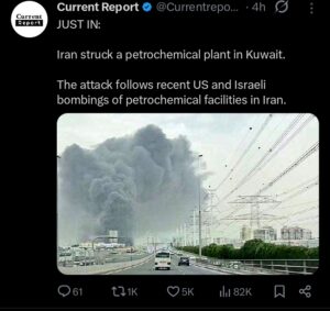 The strike, confirmed by multiple credible sources including regional media and statements from Iran’s Revolutionary Guards, targeted Kuwait’s Shuwaikh oil complex along with nearby power and desalination plants. Images circulating online showed a massive plume of black smoke rising from industrial infrastructure near a highway, visible across large sections of Kuwait City.