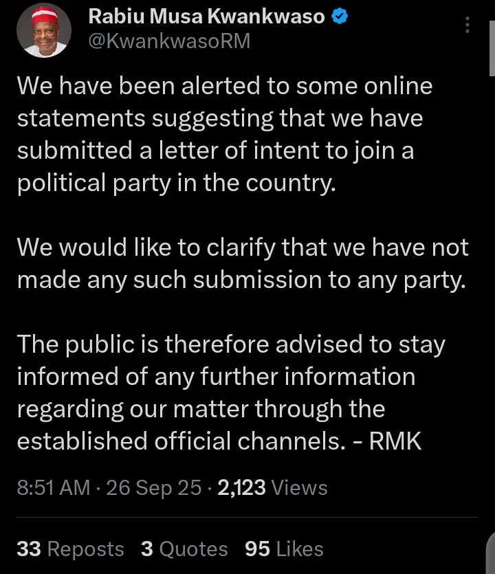 The former governor of Kano state and former presidential candidate of the New Nigeria People’s Party, NNPP, Rabiu Musa Kwankwaso has taken to his official X account on Friday, September 26, 2025 to react to report claiming that he has submitted a letter to join the All Progressive Congress, APC ahead of the 2027 elections.