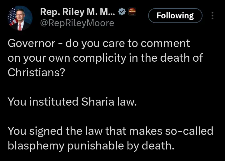 Reacting, Riley Moore said when Kwankwaso was governor, he signed law that made blasphemy punishable by death.