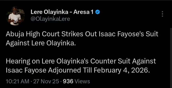 “Abuja High Court strikes out Isaac Fayose’s suit against Lere Olayinka. Hearing on Lere Olayinka’s counter suit against Isaac Fayose adjourned till February 4, 2026.” He wrote.