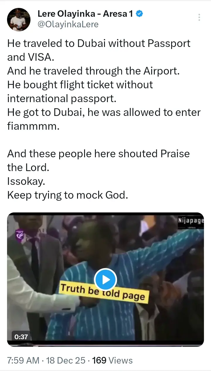 Lere Olayinka, an aide to the Minister of the Federal Capital Territory, Nyesom Wike, has reacted to a viral video showing a man giving a testimony in Pastor Chris Okafor’s church. In the video shared on X, the man claimed he travelled from Nigeria to Dubai without an international passport or a visa and was allowed to enter and stay there for weeks. As he narrated the story, members of the church reportedly celebrated loudly.