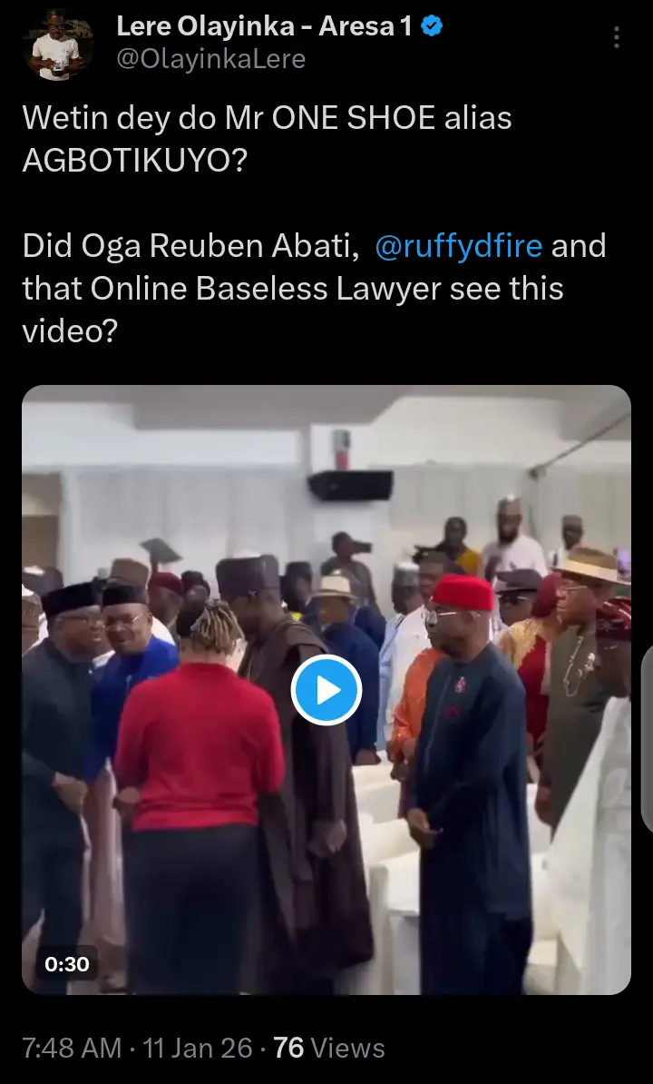 Lere Olayinka, the Senior Special Assistant on Public Communication and Social Media to the former governor of Rivers state and FCT Minister, Nyesom Wike, has taken to his official X account on Sunday, January 11, 2026 to react to video of former governor of Anambra state, Peter Obi Kneeling to Greet some people at an event.
