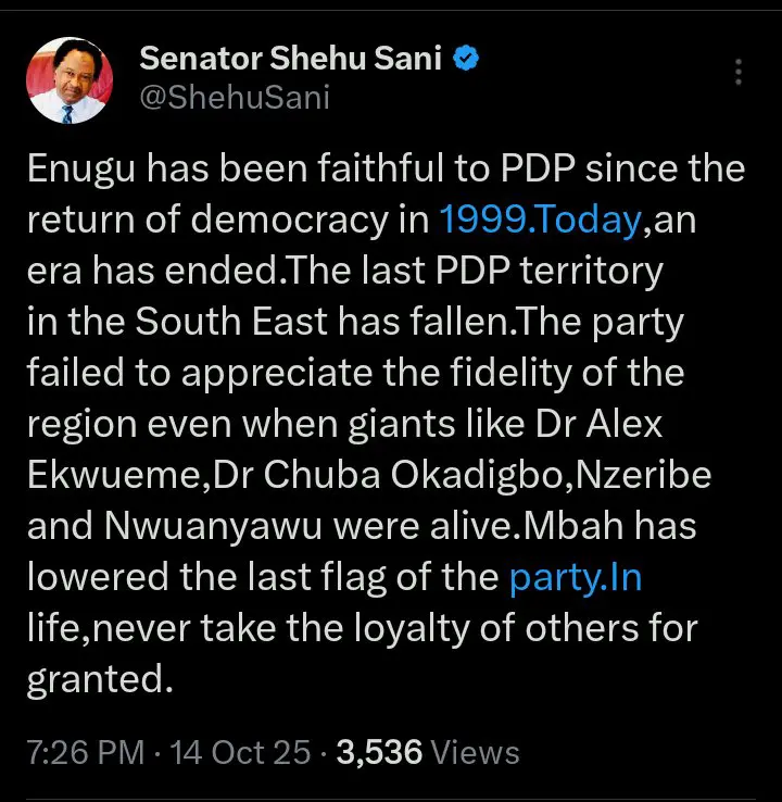 Senator Shehu Sani, a former legislator from Kaduna who represented Kaduna Central in the National Assembly, took to his official X account on Tuesday, October 14, 2025, to express his reaction to the news that Peter Mbah, the governor of Enugu state, had resigned from the Peoples Democratic Party, PDP.