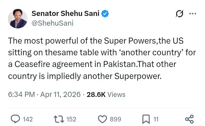 In a statement shared on his verified X (formerly Twitter) account, Sani observed that the decision of the United States—widely regarded as the world’s most powerful nation—to sit at the same table with Iran for ceasefire talks signals a form of recognition that goes beyond conventional diplomacy. According to him, such engagement implies that Iran is increasingly being treated as a rival power on the global stage.