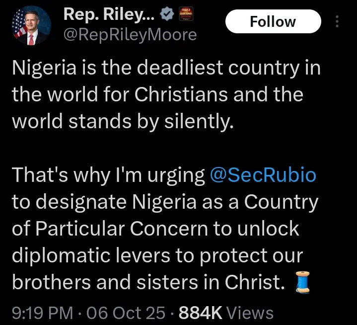 US Representative Riley Moore has called on Secretary of State Marco Rubio to take decisive action against what he describes as severe persecution of Christians in Nigeria, urging the designation of the West African nation as a Country of Particular Concern.