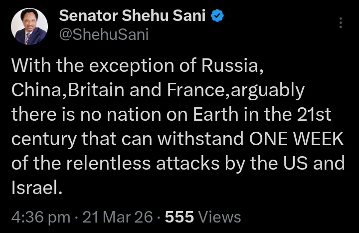 Taking to his verified X page, Sani, who is widely known for his outspoken views on international affairs, explained that Russia, China, Britain, and France are the only nations capable of enduring a week of relentless attacks from Washington and Tel Aviv.