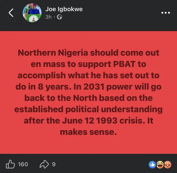 “Northerners should come out en masse to support PBAT to accomplish what he has set out to do,” Igbokwe wrote, emphasizing that the move would align with what he described as a logical and structured political progression.