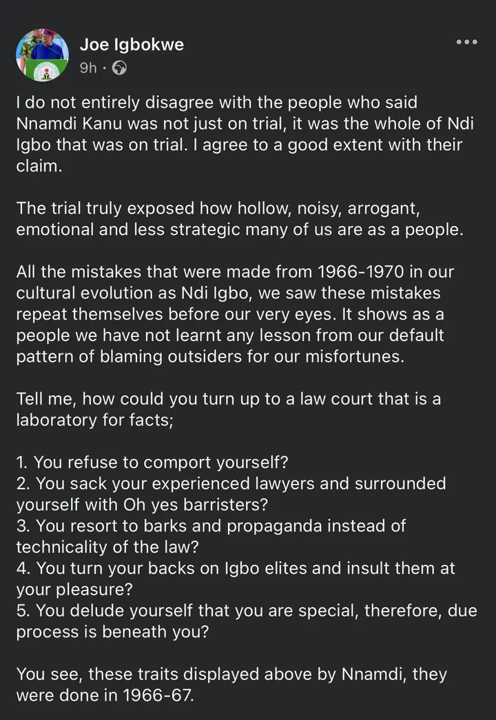 He described the trial as a mirror showing the average Igbo: “Noisy, braggadocios, lacking respect for due process, total disregard for experience, and an overriding delusion of being special.” For Igbokwe, these are not just individual failings but collective tendencies that have repeatedly undermined progress and success.