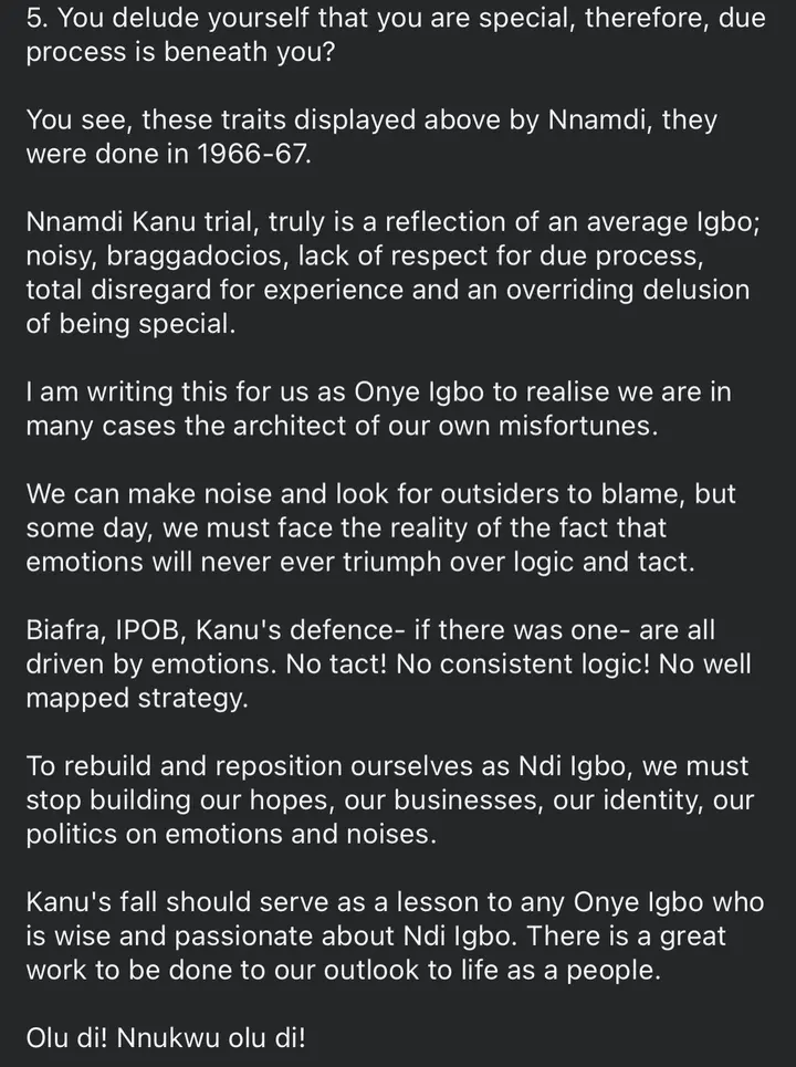 Igbokwe highlighted specific actions that reflected these flaws: ignoring professional legal advice, dismissing experienced lawyers, resorting to propaganda instead of legal technicalities, insulting Igbo elites, and assuming that due process was beneath Kanu. These traits, he argued, are symptomatic of broader cultural patterns where emotion and self-importance often override logic, planning, and discipline.