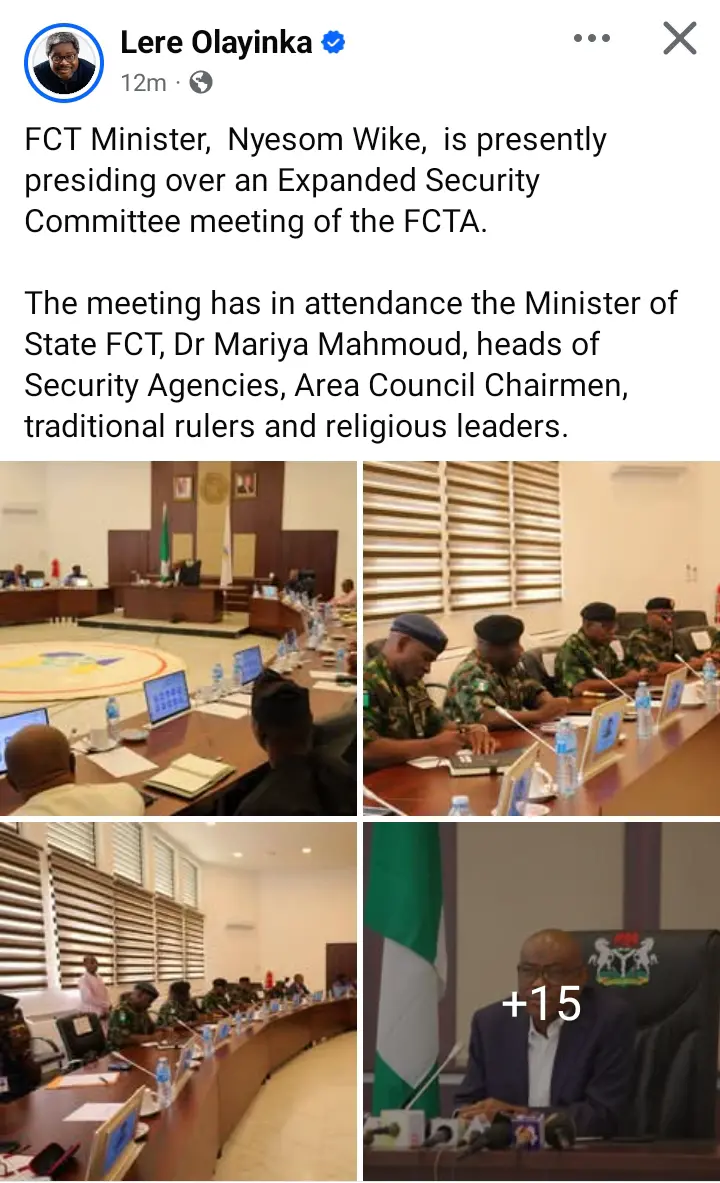 According to a media post by Honourable Lere Olayinka, media aide to the FCT Minister, on Wednesday, 26 November 2025, the Minister of the Federal Capital Territory, Nyesom Wike, is currently presiding over an Expanded Security Committee meeting of the FCTA in Abuja.