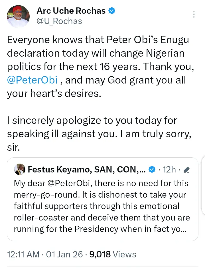 In a post that Uche Rochas shared on his page, he said Peter Obi’s declaration in Enugu will change politics in Nigeria.