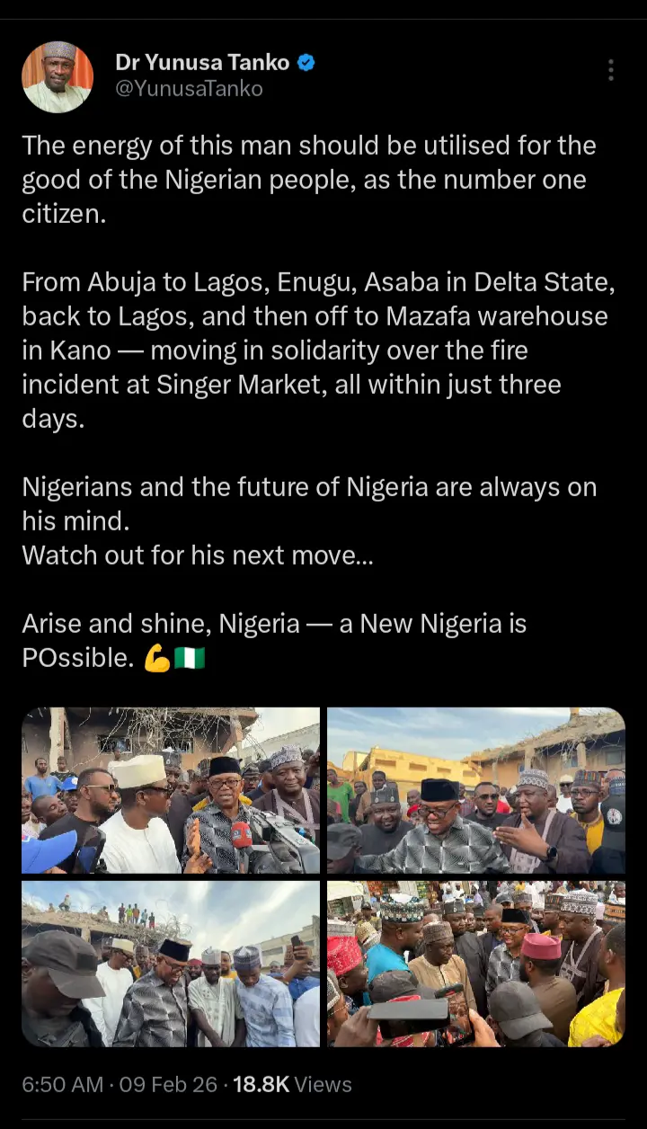 This was contained in a recent post from his senior aide and former labour party Chieftain, Yunusa Tanko which he shared on his official X handle on Monday February 9th, 2026.