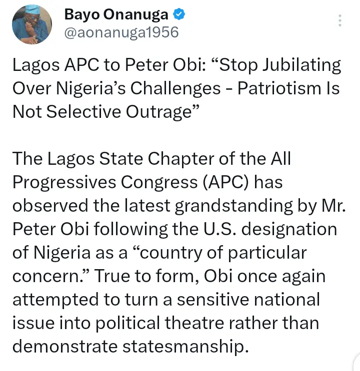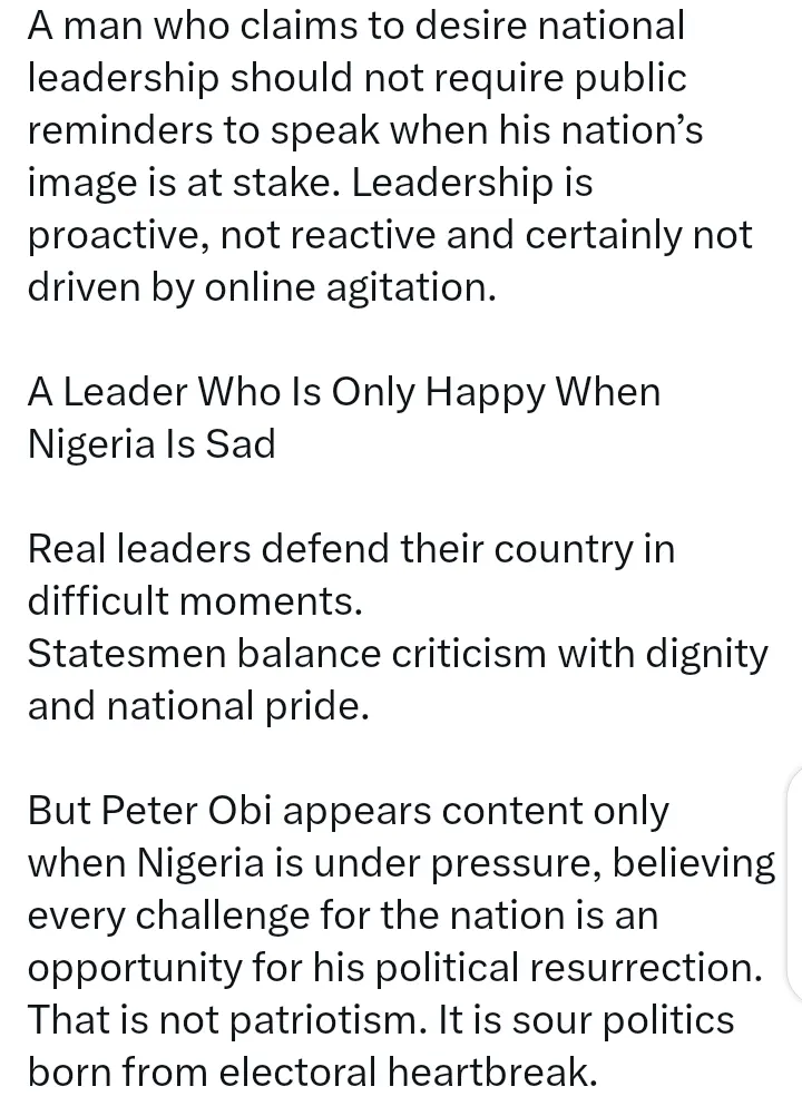 “But Peter Obi appears content only when Nigeria is under pressure, believing every challenge for the nation is an opportunity for his political resurrection. That is not patriotism. It is sour politics born from electoral heartbreak”.