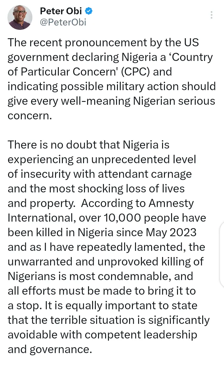 The Special Adviser to President Bola Ahmed Tinubu on Information and Strategy, Bayo Onanuga has reacted to the statement that was made by the former governor of Anambra state and Labour Party, LP, candidate in the 2023 presidential election, Peter Gregory Obi on the alleged Christian genocide in Nigeria.