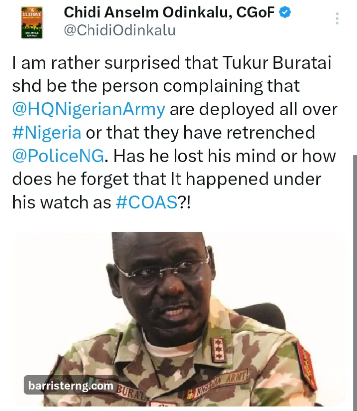 Chidi said, “I am rather surprised that Tukur Buratai shd be the person complaining that @HQNigerianArmy are deployed all over #Nigeria or that they have retrenched @PoliceNG. Has he lost his mind or how does he forget that It happened under his watch as #COAS?!”