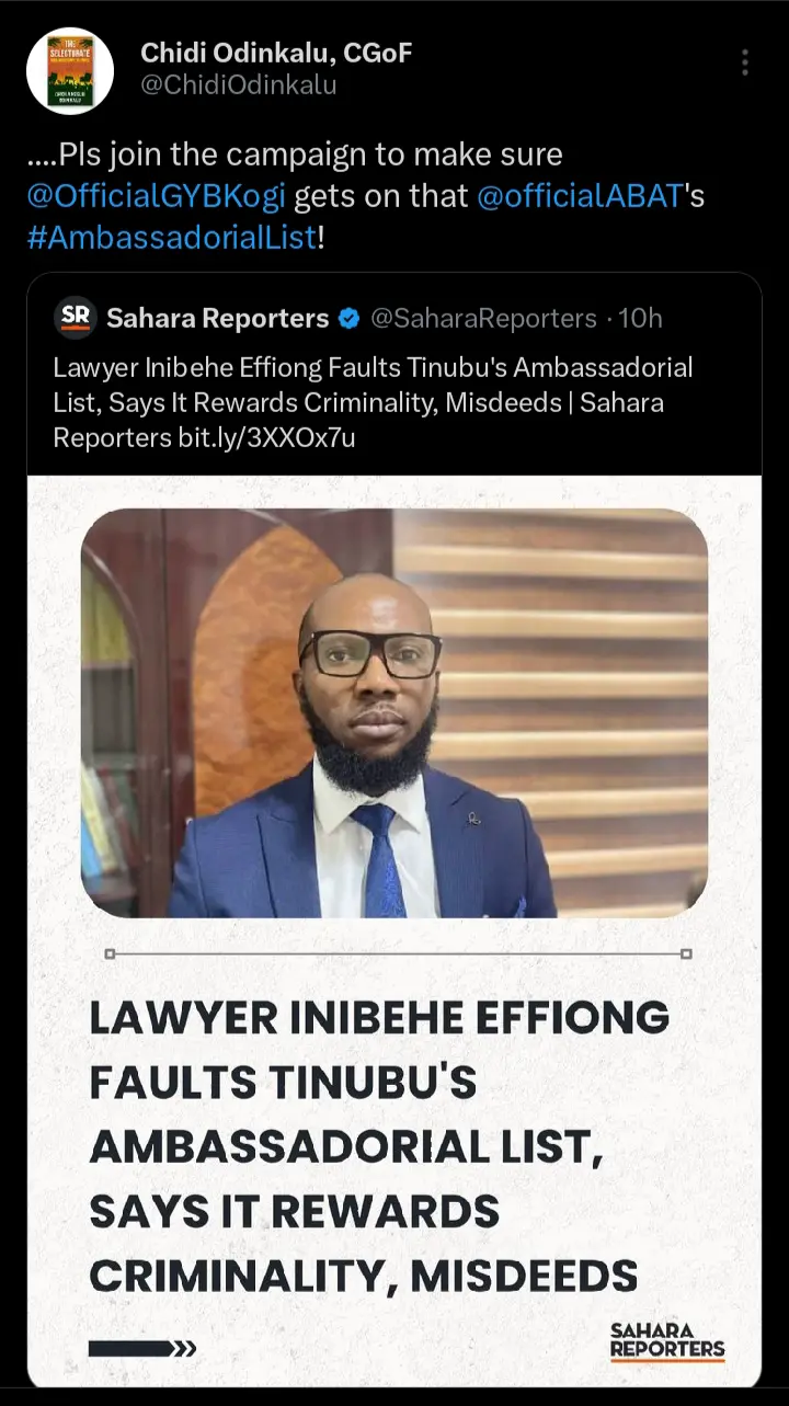 According to the statements which were shared on his official X handle, Chidi Odinkalu, well known for his outspokenness and boldness, pointed out that former Kogi State governor, Yahaya Bello should also be considered for an ambassadorial role.